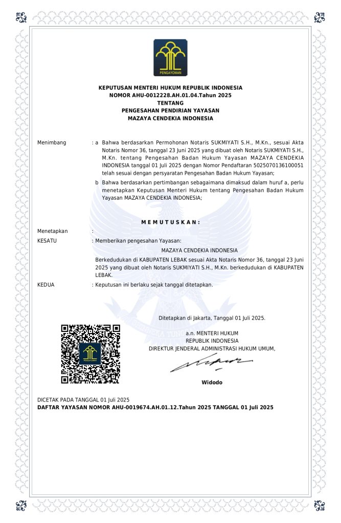 Alhamdulillahi Rabbil ‘Alamin, segala puji dan syukur kita panjatkan ke hadirat Allah SWT atas limpahan rahmat, taufik, dan hidayah-Nya sehingga Lembaga Pendidikan Mazaya Cendekia Indonesia dapat terus berkembang dalam menjalankan amanah besar di bidang pendidikan.